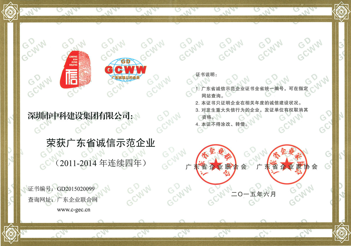 中科建設集團榮獲“2014年度廣東省誠信示范企業(yè)”稱號,這是繼2011年以來連續(xù)4年榮獲"廣東省誠信...
