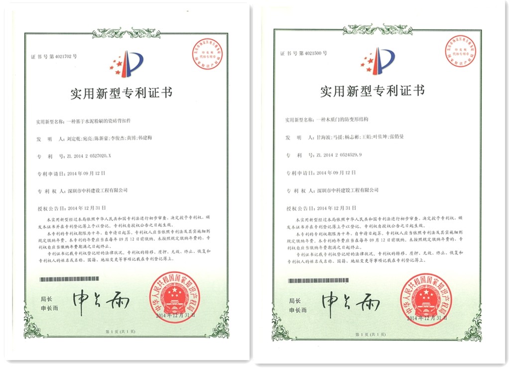 深圳市中科建設集團有限公司自主研發的“木質門的防變形結構”和“基于水泥粉的瓷磚背扣件”分別...