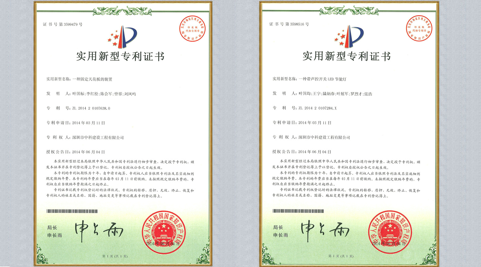 近日,由深圳市中科建設工程有限公司自主研發的“帶聲控開關的LED節能燈”和“固定天花板裝置”分別獲得中華人民共和國知識產權局頒發的“實用新型專利證書”。這是中科建設在自主創新的道路上,取得的突破性成績。